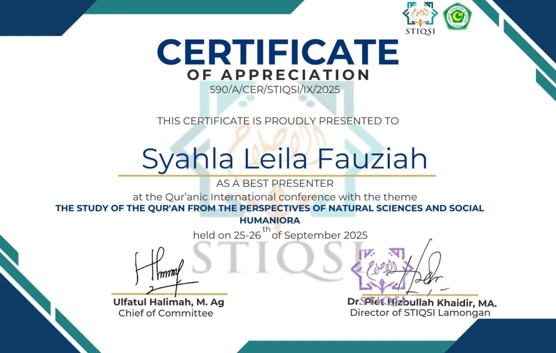 Surakarta, 27 September 2025 – Prestasi membanggakan kembali diraih oleh sivitas akademika Program Studi Tasawuf dan Psikoterapi (Prodi TP) UIN Raden Mas Said Surakarta. Salah satu dosen Prodi TP, Dr. Hamdan Maghribi, M.Phil, bersama mahasiswa Syahla Leila Fauziah, berhasil meraih penghargaan Best Presenter dalam ajang Qur’anic International Conference 2025 yang diselenggarakan oleh Sekolah Tinggi Ilmu al-Qur’an dan Sains Islam (STIQSI) Lamongan pada tanggal 25–26 September 2025 secara daring.